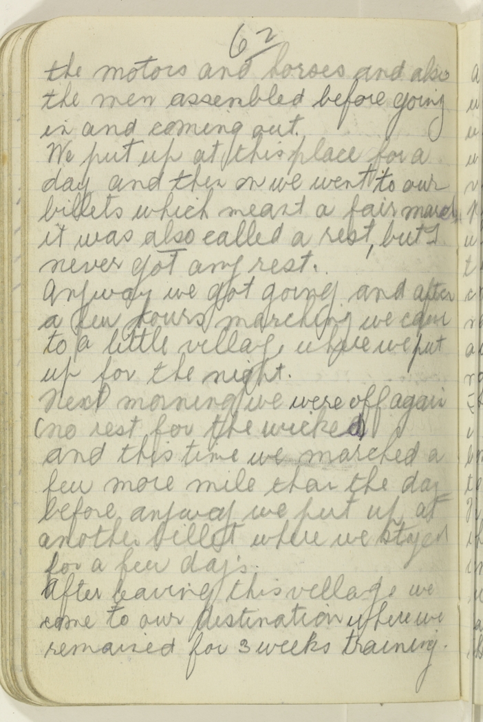 We put up at this place for a day and then on we went to our billets which meant a fair march, it was also called a rest, but I never got any rest.