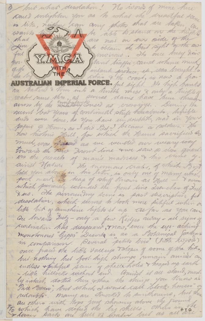 <p>a4701780.html</p><p>3/ but what desolation! No words of mine here could enlighten you as to what the dreadful scene is like, neither can any photos that are taken, one wants to be able to stand on the heights that are now on our side of the Line to obtain the best sight of the awful environs. The once busy & important traffic-canal whence much of the inland produce, etc., was brought to the big cities & the coast, is now a fearful sight. Its high banks are battered & torn into a terrible mess & only a trickle of water runs thro., as several dams have been thrown across by the combatants & used as crossings. During the recent bad years of continual strife hereabouts, terrible deeds were done, as you have undoubtedly read in your papers @ Home, as I did B4 I became a soldier. The now historic Hill, for which the Huns sacrificed so much, was passed as we wended our weary way towards the new Front line & we saw @ close quarters the results of man's madness & his crime against Nature. The enormous crater, of which Bert told you about in his letter, is only one of many which pock mark the heap of stuff known as Hill - & across which previously extended the front line Trenches of Fritz & us. The surrounding scene is past description for desolation, which seems to look more pitiful when a little bit of sunshine lights it up. As far as you can see towards Fritz - only a few Ridges away - all signs of civilisation has disappeared, & now, even the eye-aching monotonous "Gippo" Desert<s>s</s> is as a Botanical Gardens in comparison. Several "petits bois" (little woods) once graced the little valleys & slopes of some of the hills, but nothing but foot high stumps remain amidst an endless & pitiful scene of shell holes & heaped up earth - little hillocks without end. Amidst it all stand, mostly intact, dotted here & there the things you know as "Pill Boxes", but which I would call "block-houses" or redoubts. Many are knocked to smithereens, but there are others with tops just showing above the ground which have defied the big shells. Others in the lower parts are full of water but as all are</p><p> </p><p>PTO → [in bottom left hand margin]</p>
