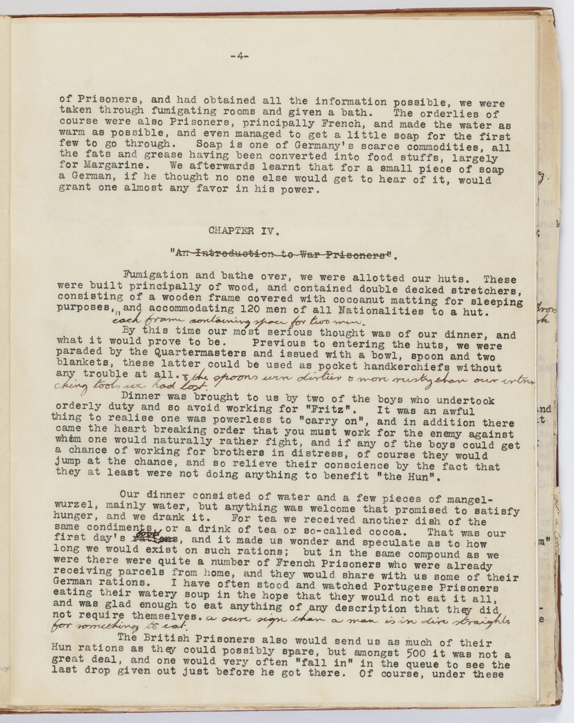 of Prisoners, and had obtained all the information possible, we were taken through fumigating rooms and given a bath.. The orderlies of course were all prisoners, principally French, and made the water as warm as possible, and even managed to get a little soap for the first few to go through. Soap is one of Germany's scarce commodities, all the fat and grease having been converted to food stuffs, largely for Margarine. We afterwards learnt that for a small piece of soap a German, if he thought no one else would get to hear of it, would grant one almost any favour in his power