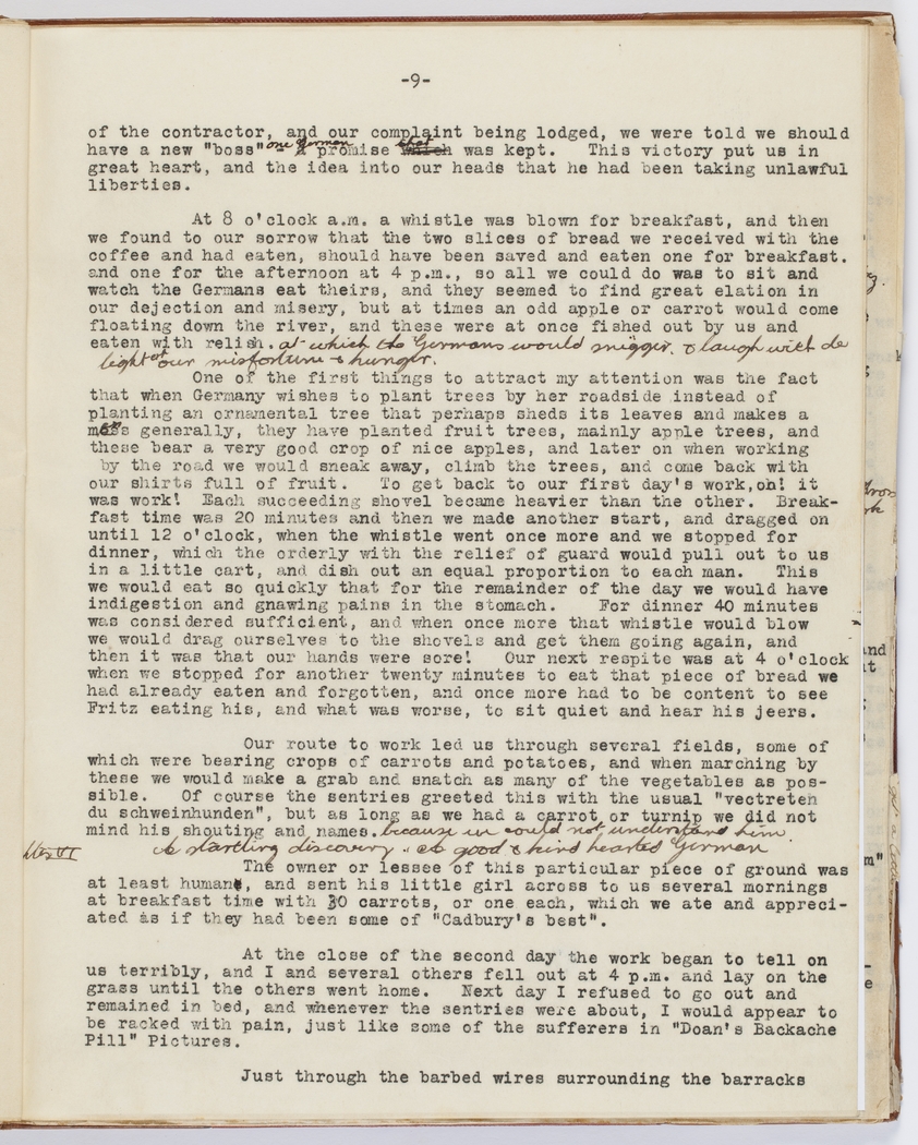 At 8 o'clock a.m. a whistle was blown for breakfast, and then we found to our sorrow that the two slices of bread we received with the coffee and had eaten, should have been saved and eaten one for breakfast, and one for the afternoon at 4 p.m., so all we could do was sit and watch the Germans eat theirs, and they seemed to find great elation in our dejection and misery, but at times an odd apple or carrot would come floating down the river, and these were at once fished out by us and eaten with relish, at which the Germans would snigger, & laugh with delight at our misfortune & hunger.