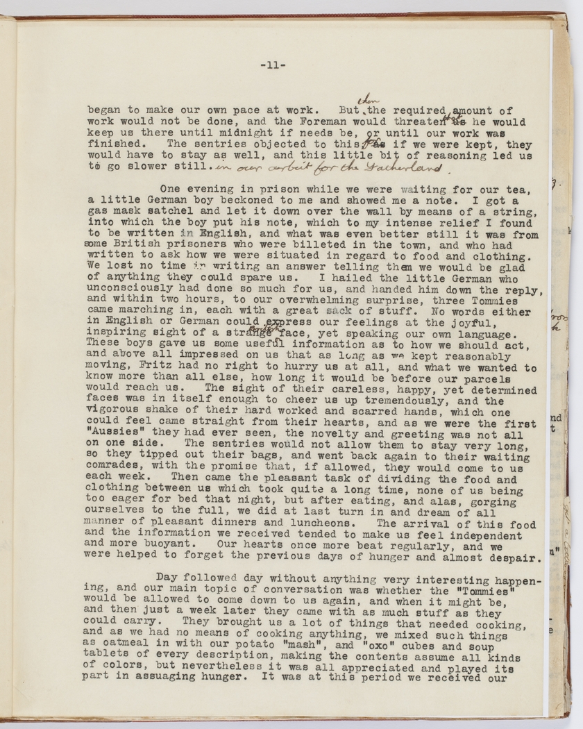 One evening in prison while waiting for our tea, a little German boy beckoned to me and showed me a note. I got a gas mask satchel and let it down over the wall by means of string, into which the boy put his note, which to my intense relief I found to be written in English, and what was even better still it was from some British prisoners who were billeted in the town, and who had written to ask how we were situated in regard to food and clothing. We lost no time in writing an answer we would be glad of anything they could spare us. I hailed the little German who unconsciously had done so much for us, and handed him down the reply, and within two hours, to our overwhelming surprise, three Tommies came marching in, each with a great stack of stuff. No words in either English or German could express our feelings of the joyful, inspiring sight of a strange [indecipherable] face, yet speaking our own language. These boys gave us some useful information as to how we should act, and above all impressed on us that as long as we kept reasonably moving, Fritz had no right to hurry us at all, and what we wanted to know more than anything else, how long it would be before our parcels would reach us. The sight of their careless, happy, yet determined faces was in itself enough to cheer us up tremendously, and the vigorous shake of their hard worked and scarred hands, which one could feel came straight from their hearts, and as we were the first "Aussies" they had ever seen, the novelty and greeting was not all on one side. The sentries would not allow them to stay very long, so they tipped out their bags, and went back to their waiting comrades, with the promise that, if allowed, they would come to us each week. Then came the pleasant task of dividing the food and clothing between us which took quite a long time, but after eating, and alas, gorging ourselves to the full, we did at last turn in and dream of all manner of pleasant dinners and luncheons. The arrival of this food and the information we received tended to make us feel independent and more buoyant. Our hearts once more beat regularly, and we were helped to forget the previous days of hunger and almost despair.