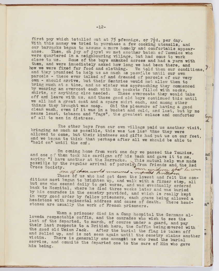 first pay which totalled out at 75 pfennigs, or 71/2 d. per day. With the money we tried to purchase a few cooking utensils, and our barracks began to assume a more homely and comfortable appearance. Then. oh joy of joys, we met another bunch of Tommies who were quartered in a neighbouring village, but had come to work close to us. Some of the boys sneaked across and had a yarn with them, and were immediately asked how long we had been there, and how we were fixed for food and clothing. We told them of our conditions, and they promised to help us as much as possible until own parcels – these ever talked of and dreamed of parcels of our very own – should arrive, but their sentries would not allow them to bring much at a time, and as winter was approaching they commenced by wearing an overcoat each with the pockets filled with socks, shirts, or anything else needed. These overcoats they would take off and leave with us, and those good old boys continued this until we all had a great coat and a spare shirt each, and among other things they brought was soap. Oh! the pleasure of having a good clean wash, even if it was in a bucket and cold, and last, but by no means least, tobacco and "fags", the greatest solace and comforter of all to men in distress.