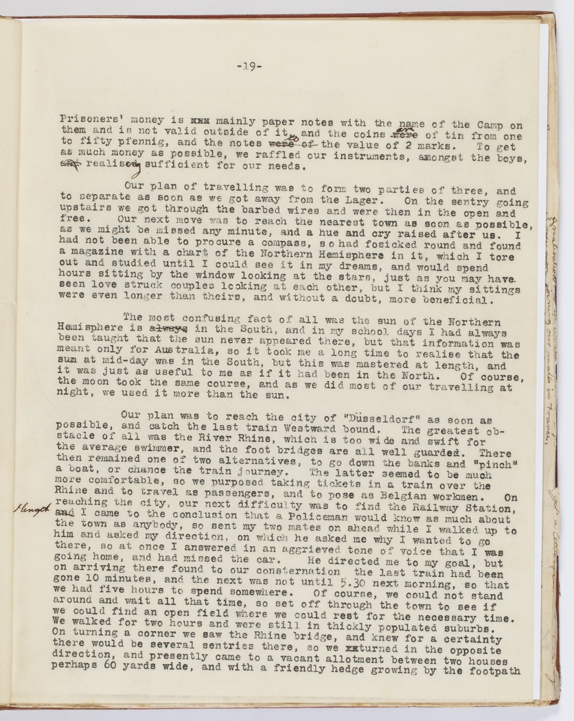 bridges are all well guarded. There then remained one of two alternatives, to go down the banks and "pinch" a boat, or chance the train journey. The latter seemed to be much more comfortable, so we purposed taking tickets in a train over the Rhine and to travel as passengers, and to pose as Belgian workmen. On reaching the city, our next difficulty was finding the Railway Station, at length I came to the conclusion that a Policeman would know as much about the town as anybody, so sent my two mates on ahead while I walked up to him and asked my direction, on which he asked me why I wanted to go there, so at once I answered in an aggrieved tone of voice that I was going home, and had missed the car. He directed me to my goal, but on arriving there found to our consternation the last train had been gone 10 minutes, and the next was not till 5.30 the next morning, so that we had five hours to spend somewhere. Of course we could not stand around, so set off through the town to see if we could find an open field where we could rest for the necessary time. We walked for two hours and were still in thickly populated suburbs. On turning a corner we saw the Rhine bridge, and knew for a certainty that there would be several sentries there, so we turned in the opposite direction, and presently came to a vacant allotment between two houses perhaps sixty yards wide, and with a friendly hedge growing by the footpath