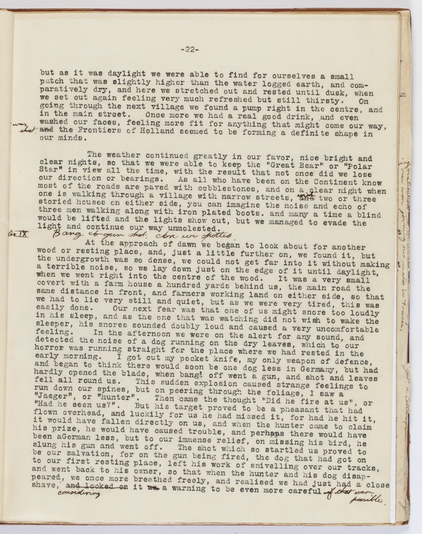 At the approach of dawn we began to look about for another wood or resting place, and, just a little further on, we found it, but the undergrowth was so dense, we could not get far into it without making a terrible noise, so we lay down just on the edge of it until daylight, when we went right into the centre of the wood. It was a very small covert with a farm house a hundred yards behind us, the main road the same distance in front, and farmers working land on either side, so that we had to lie very still and quiet, but as we were very tired, this was easily done. Our next fear was that one of us might snore too loudly in his sleep, and as the one who was watching did not wish to wake the sleeper, his snores seemed doubly loud and caused a very uncomfortable feeling. In the afternoon we were on the alert for any sound, and detected the noise of a dog running on the dry leaves, which to our horror was running straight for the place where we had rested in the early morning. I got out my pocket knife, my only weapon of defence, and began to think that there would be one dog less in Germany, but had hardly opened the blade, when bang! off went a gun, and shot and leaves fell all round us. This sudden explosion caused strange feelings to run down our spines, but on peering through the foliage, I saw a "Jaeger", or "hunter". Then came the thought "Did he fire at us" or "Had he seen us?". But his target proved to be a pheasant that had flown overhead, and luckily for us he had missed it, for had he hit it, it would have fallen directly on us, and when the hunter came to collect his prize, he would have caused trouble, and perhaps there would have been aGerman less, but to our immense relief, on missing his bird, he slung his gun and went off. The shot which so startled us proved to be our salvation, for on the gun being fired, the dog that had got on to our first resting place, left his work of snivelling over our tracks, and went back to his owner, so that when the hunter and his dog disappeared, we once more breathed freely, and realised we had just had a close shave, and looked on considering it as a warning to be even more careful if that were possible.