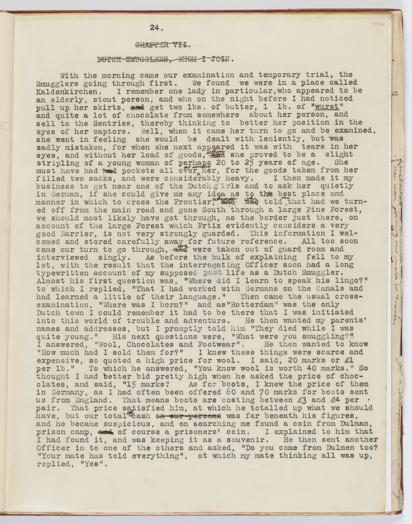With the morning came our examination and trial, the Smugglers going through first. We found we were in a place called Kaldenkirchen. I remember one lady in particular, who appeared to be an elderly, stout person, and who on the night before I had noticed pull up her skirts, and get two pounds of butter, one pound of "wurst" and quite a lot of chocolate from somewhere about her person, and sell to the sentries, thereby thinking to better her position in the eyes of her captors. Well, when it came her turn to go and be examined, she went in feeling she would be dealt with leniently, but was sadly mistaken, for when she next appeared it was with tears in her eyes, and without her load of goods [indecipherable] she proved to be a slight stripling of a young woman of perhaps 20 to 25 years of age. She must have had had pockets all over or under her, for the goods taken from her filled two sacks, and were considerably heavy. I then made it my business to get near one of the Dutch girls and to ask her quietly in German, if she could give me any idea of the best place and manner in which to cross the frontier, [indecipherable] she told me, that had we turned off the main road and gone south through a large Pine Forest, we should most likely have got through, as the border just there, on account of the large Forest which Frtiz evidently considers a very good barrier, is not very strongly guarded. This information I welcomed and stored carefully away for future reference. All too soon came our turn to go through, we were taken out of the guard room and interviewed singly. As before the bulk of explaining fell to my lot, with the result that that the interrogating officer soon had a long typewritten account of my supposed life as a Dutch Smuggler. Almost his first question was, "Where did I learn to speak his lingo?." to which I replied, "That I had worked with Germans on the Canals and had learnt a little of their language". Then came the usual cross-examination, 'Where was I born?" and as "Rotterdam" was the only Dutch town I could remember it had to be there that I was initiated into this world of trouble and adventure. He then wanted my parents' names and addresses, but I promptly told him "They died wen I was quite young". His next questions were "What were you smuggling?." I answered, "Wool, Chocolates and Footwear". He then wanted to know "How much I sold them for.?" I knew these things were scarce and expensive, so quoted a high price for wool. I said, 20 marks or £1 per pound." To which he answered, "You know wool is worth 40 marks." So thought I should better bid pretty high when he asked the price of chocolates, and said, "15 marks." As for boots, I knew the price of them in Germany, as I had often been offered 60 and 70 marks for boots sent to us from England. That means boots are costing between £3 and £4per pair. That price satisfied him, at which he totalled up what we should have, but our total cash on our persons was far beneath his figures, and he became suspicious, and on searching me found a coin from Dulman, prison camp, of course a prisoners' coin. I explained to him that I had found it, and was keeping it as a souvenir. He then sent another officer in to one of the others and asked, "Do you come from Dulman too? "Your mate has told everything", at which my mate thinking all was up, replied, "Yes".