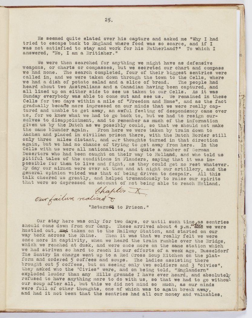 He seemed quite elated over his capture and asked me "Why I had tried to escape back to England where food was so scarce, and if I was not satisfied to stay and work for his Fatherland?" To which I answered, "No, I am a Britisher."