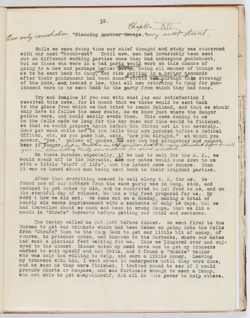 While we were doing our time our chief thought and study was concerned with our next "breakout." Until now, men had invariably been sent out on different working parties once they had undergone punishment, but as those who were in a bad party would work on this chance of going to a new and perhaps better [indecipherable] , doing all manner of things as to be sent back to camp cells, and risk getting into a better commando after their punishment had been done, this procedure was discontinued. Fritz saw through this strategy of the lads, issued a law, that all men returning to camp for punishment were to be sent back to the party from which they had come.