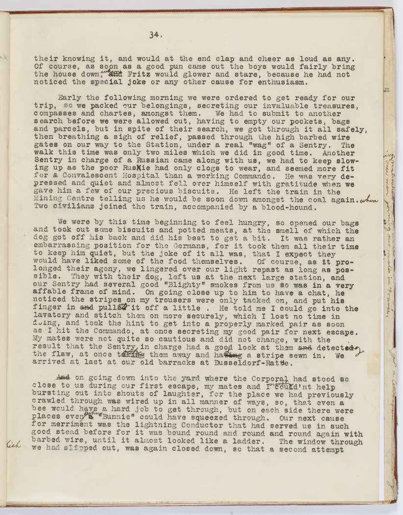 On going down into the yard where the Corporal had stood so close to us during our first escape, my mates and I [indecipherable] could not help bursting out in shouts of laughter, for the place we had previously crawled through was wired up in all manner of ways, so, that even a bee would have a hard job to get through, but on each side there were places even [indecipherable] "Bunny" could have squeezed through. Our next cause for merriment was the lightening Conductor that had served us in such good stead before for it was bound round and round and round again with barbed wire, until it almost looked like a ladder. The window through which we had slipped out, was again closed down, so that a second attempt