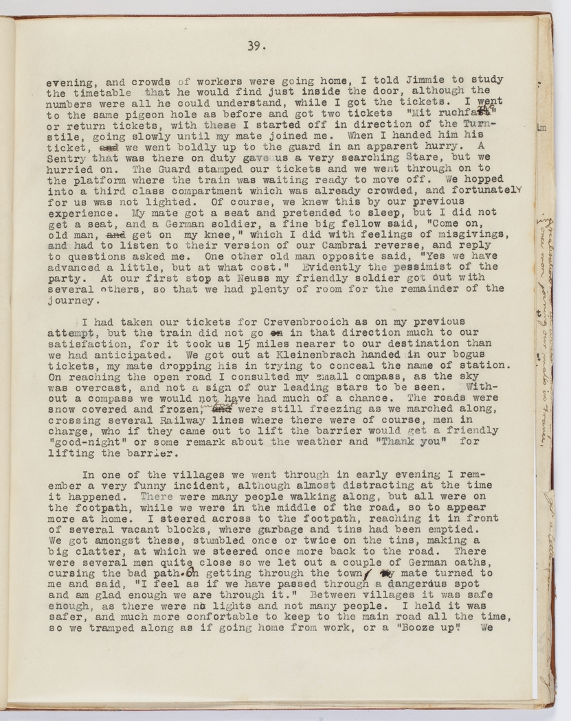 evening, and crowds of workers were going home, so I told Jimmy to study the timetable that he would find just inside the door, although the numbers were all he could understand, while I got the tickets. I went to the same pigeon hole as before and got two tickets "Mit ruchfahr' or return tickets, with these I started of in the direction of the Turnstile, going slowly until my mate joined me. When I handed him his ticket, we went boldly up to the guard in an apparent hurry. A Sentry that was there on duty gave us a very searching stare, but we hurried on. The Guard stamped our tickets and we went through onto the platform where the train was waiting ready to move off. We hopped into a third class compartment which was already crowded, and fortunately for us was not lighted. Of course, we knew this by our previous experience. My mate got a seat and pretended to sleep, but I did not get a seat, and a German soldier, a fine big fellow said, "Come on, old man get on my knee," which I did with feelings of misgivings, and had to listen to their version of our Cambrai reverse, and to reply to questions asked me. One other old man opposite said, "Yes we have advanced a little but at what cost." Evidently the pessimist of the party. At our first stop at Neuss my friendly soldier got out with several others, so we had plenty of room for the remainder of the journey.