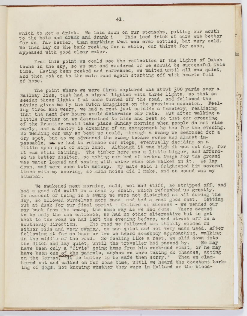 We awakened next morning, cold, wet and stiff, so stripped off, and had a good old swill in a nearby drain, which refreshed us greatly. On account of being in a swamp we were not disturbed at all during the day, so allowed ourselves more ease, and had a real good rest. Setting out at dusk for our final sprint – failure or success – we wended our way back from the swamp, the same way as we had come. There seemed to be only the one entrance, so had no other alternative but to get back to the road we had left the evening before, and struck off in a southerly direction. The road we followed was thickly wooded on either side and very swampy, so was quiet and not very much used. After following it for about an hour or two we heard somebody approaching, walking in the middle of the road. So feeling like a rest, we slid down into the ditch and lay quiet, until the traveller had passed by. He may have been only a "Civie" going home from his week-end visit, or he may have been one of the patrols, anyhow we were taking no chances, acting on the German [indecipherable] "it is better to be safe than sorry." Then we clambered out and walked on for some time, until we heard the constant barking of dogs, not knowing whether they were in Holland or the blood-