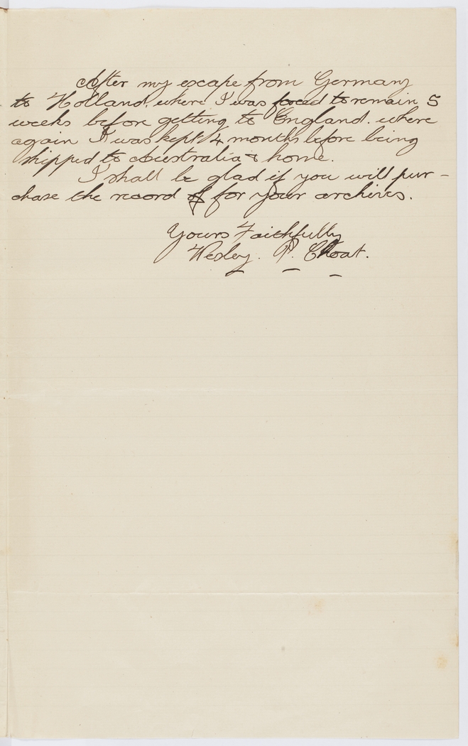 After my escape from Germany to Holland where I was forced to remain 5 weeks before getting to England where again I was kept 4 months before being shipped to Australia & home.