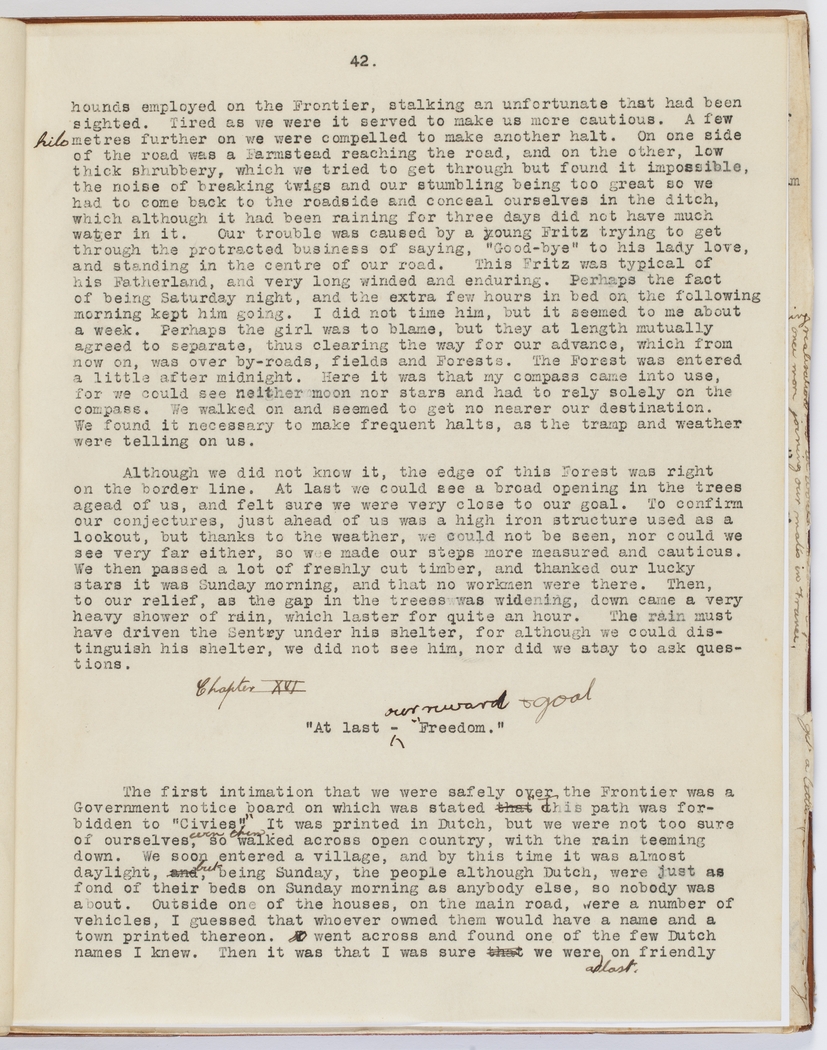 hounds employed on the Frontier, stalking an unfortunate that had been sighted. Tired as we were it served to make us more cautious. A few kilometres further on we were compelled to make another halt. On one side of the road was a Farmstead reaching the road, and on the other, low thick shrubbery, which we tried to get through but found it impossible, the noise of breaking twigs and our stumbling being too great so we had to come back to the roadside and conceal ourselves in the ditch, which although it had been raining for three days did not have much water in it. Our trouble was caused by a young Fritz trying to get through the protracted business of saying, "Good-bye" to his lady love, and standing in the centre of our road. This Fritz was typical of his Fatherland, and very long winded and enduring. Perhaps the fact of being Saturday night, and the extra few hours in bed on the following morning kept him going. I did not time him, but it seemed to me to be about a week. Perhaps this girl was to blame, but at length mutually agreed to separate, thus clearing the way for our advance, which from now on, was over by-roads, fields and Forests. The Forest was entered a little after midnight. Here it was that my compass came into use, for we could see neither moon nor stars and had to rely solely on the compass. We walked on and seemed to get no nearer to our destination. We found it necessary to make frequent halts, as the tramp and weather were telling on us.