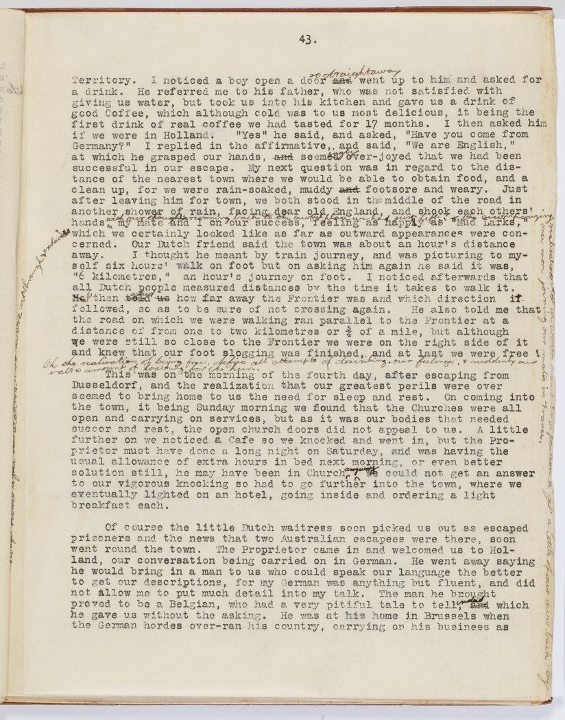 Territory. I noticed a boy open a door so straight away went up to him and asked for a drink. He referred me to his father, who was not satisfied with giving us water, but took us into his kitchen and gave us a drink of good Coffee, which although cold was to us most delicious, it being the first drink of real coffee we had tasted for 17 months. I then asked him if we were in Holland? "Yes" he said, and asked, "Have you come from Germany?" I replied in the affirmative, and said "We are English," at which he grasped our hands, seemingly over-joyed that we had been successful in our escape. My next question was in regard to the distance of the nearest town where we would be able to obtain food, and a clean up, for we were rain-soaked, muddy footsore and weary. Just after leaving him for town, we both stood in the middle of the road in another shower of rain, facing dear old England, and shook each others hands, with our thoughts running back to the awful place we had just left and the encouraging realisation that we would soon be in a position to get a bit of our own back again once more joining our mates in France, no longer seemd to feel our weariness or that we were wet through and shivering, my mate and I on our success, feeling as happy as "Mud Larks", which we certainly looked like as far as outward appearances were concerned. Our Dutch friend said the town was about an hour's distance away. I thought it meant by train journey, and was picturing myself six hour's walk on foot but on asking him again he said it was "6 kilometres," an hour"s journey on foot. I noticed afterwards that all Dutch people measured distance by the time it takes to walk it. I then asked how far away the Frontier was and which direction it followed, so as to be sure of not crossing it again. He also told me that the road on which we were walking ran parallel to the Frontier at a distance of from one to two kilometres or ¼ of a mile, but although we were still so close to the Frontier we were on the right side of it and knew that our foot slogging was finished, and at last we were free. Oh the realisation of being free defies all attempts of describing our feelings & suddenly our extra amount of loathing for the hun.