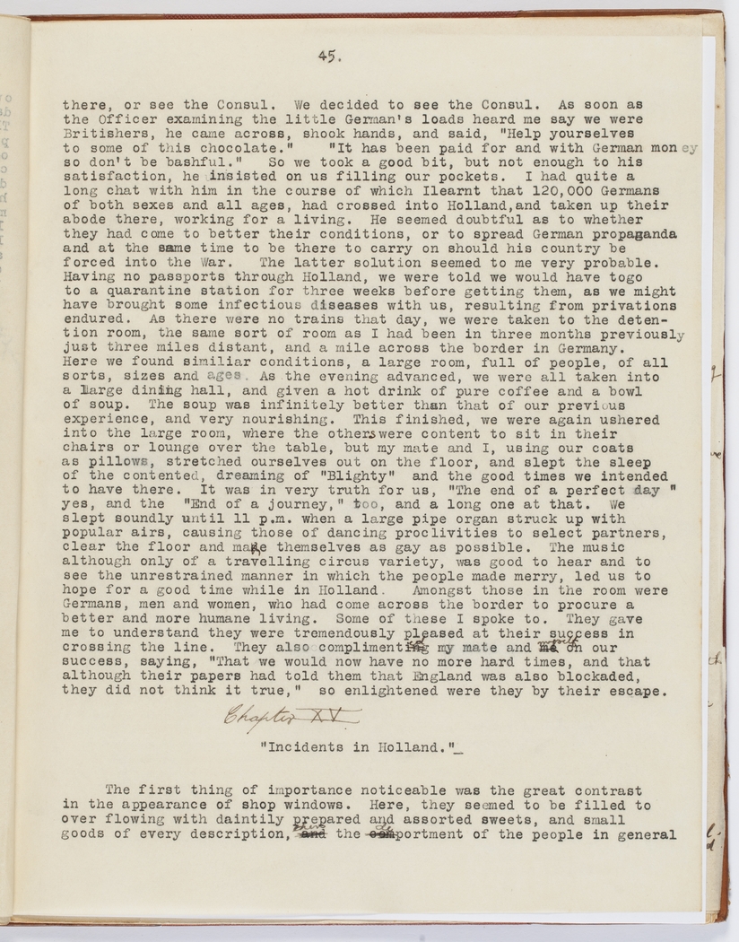there or see the Consul. We decided to see the Consul. As soon as the officer examining the little German's loads heard me say we were Britishers, he came across, shook hands, and said, "Help yourselves to some of this chocolate." "It has been paid for and with German money so don't be bashful." So we took a good bit, but not enough to his satisfaction, he insisted on us filling our pockets. I had quite a long chat with him in the course of which I learnt that 120,000 Germans of both sexes and all ages, had crossed into Holland and taken up their abode there, working for a living. He seemed doubtful whether they had come to better their conditions, or to spread German propaganda and at the same time to be there to carry on should his country be forced into the war. The latter solution seemed to me to be very probable. Having no passports through Holland, we were told we would have togo to a quarantine station for three weeks before getting them, as we might have brought some infectious diseases with us, resulting from privations endured. As there were no trains that day, we were taken to the detention room, the same sort of room I had been in three months previously just three miles distant, and a mile across the border in Germany. Here we found similar conditions, a large room, full of people, of all sorts, sizes and ages. As the evening advanced, we were all taken into a large dining hall, and given a hot drink of pure coffee and a bowl of soup. The soup was infinitely better than that of our previous experience, and very nourishing. This finished, we were again ushered into the large room, where the others were content to sit in their chairs or lounge over the table, but my mate and I, using our coats as pillows, stretched ourselves out on the floor, and slept the sleep of the contented, dreaming of "Blighty" and the good times we intended to have there. It was in very truth for us, "The end of a perfect day" yes and the "End of a journey," too, and a long one at that. We slept soundly until 11 p.m. when a large organ struck up with popular airs, causing those of dancing proclivities to select partners, clear the floor and make themselves as gay as possible. The music although of the travelling circus variety, was good to hear and to see the unrestrained manner in which the people made merry led us to hope for a good time while in Holland. Amongst those in the room were Germans, men and women, who had come across the border to procure a better and more humane living. Some of these I spoke to. They gave me to understand that they were tremendously pleased at their success in crossing the line. They also complemented my mate and me myself on our success, saying, "That we would now have no more hard times, and that although their papers had told them that England was also blockaded, they did not think it true," so enlightened were they by their escape.