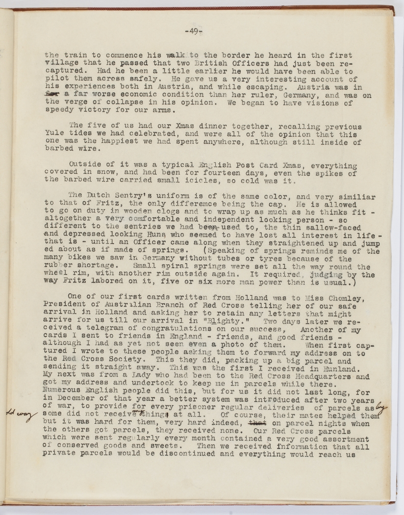 One of our first cards written from Holland was to Miss Chomley, President of the Australian Branch of the Red Cross telling her of our safe arrival in Holland and asking her to retain any letters that might arrive for us till our arrival in "Blighty". Two days later we received a telegram of congratulations on our success. Another of my cards I sent to friends in England – friends, and good friends – although I had as yet not seen even a photo of them. When first captured I wrote to these people asking them to forward my address on to the Red Cross Society. This they did, packing up a big parcel and sending it straight away. This was the first I received in Hunland. My next was from a Lady who had been to the Red Cross Headquarters and got my address and undertook to keep me in parcels while there. Numerous English people did this, but for us it did not last long, for in December of that year a better system was introduced after two years of war, to provide for every prisoner regular delivery of parcels as by the old way some did not receive anything at all. Of course, their mates helped them but it was hard for them, very hard indeed, that on parcel nights when others got parcels, they received none. Our Red Cross parcels which were sent regularly every month contained a very good assortment of conserved goods and sweets. Then we received information that all private parcels would be discontinued and everything would reach us