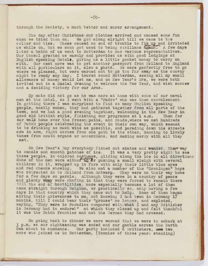The day after Christmas our clothes arrived and caused some fun when we tried them on. We got along alright till we came to the collar and ties. These caused no end of trouble to fix up and irritated us while on, but we soon got used to being civilians again once more. A few days later a batch of us went to Rotterdam to our various representatives. Our Consul greeted us warmly and provided us with good lodgings at English speaking Hotels, giving us a little pocket money to carry on with. Our next move was to get another passport from Holland to England with all particulars on it, also a photo. We were perfectly free to go where we pleased but were warned not to go too far away as the convoy might be ready any day. I toured round Rotterdam, seeing all my small allowance of money would let me, and on New Year's Eve, we were both invited out to a Social Evening to welcome the New Year, and to wish success and a deciding victory for our Arms.