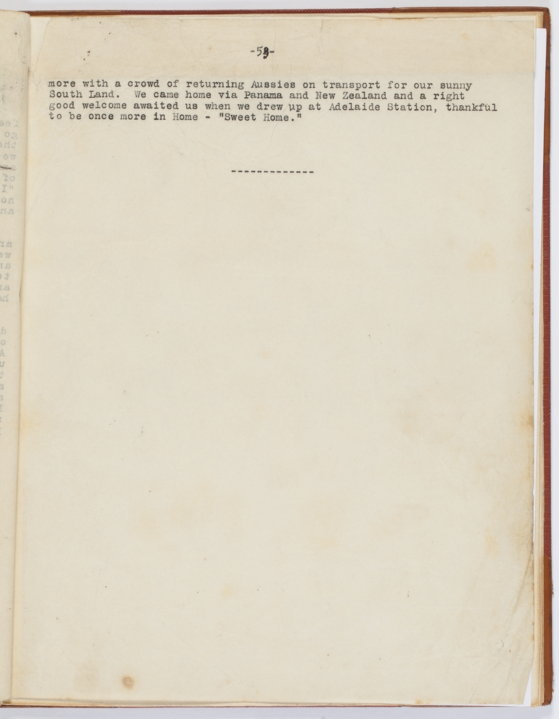 more with a crowd of returning Aussies on transport for our sunny South Land. We came home via Panama and New Zealand and a right good welcome awaited us as we drew up at Adelaide Station, thankful to be once more in Home –'Sweet Home."