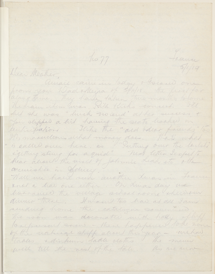 A mail came in today & I scored one from you Dad & Myra of 3/11/18 the first for a long time. They have taken two months to come. The main item was Rita Kirks concert. I'll bet she was "buck no end" at her success & you slipped a bit having the seats booked in anticipation. I like the "old & dear friends" too. It is marvellous what money does. That's what is called over here as "Putting over the bulsh" & "getting stung for a quid". Next letter I expect to hear about the visit of Johnnie Leah etc & the armistice in Sydney.