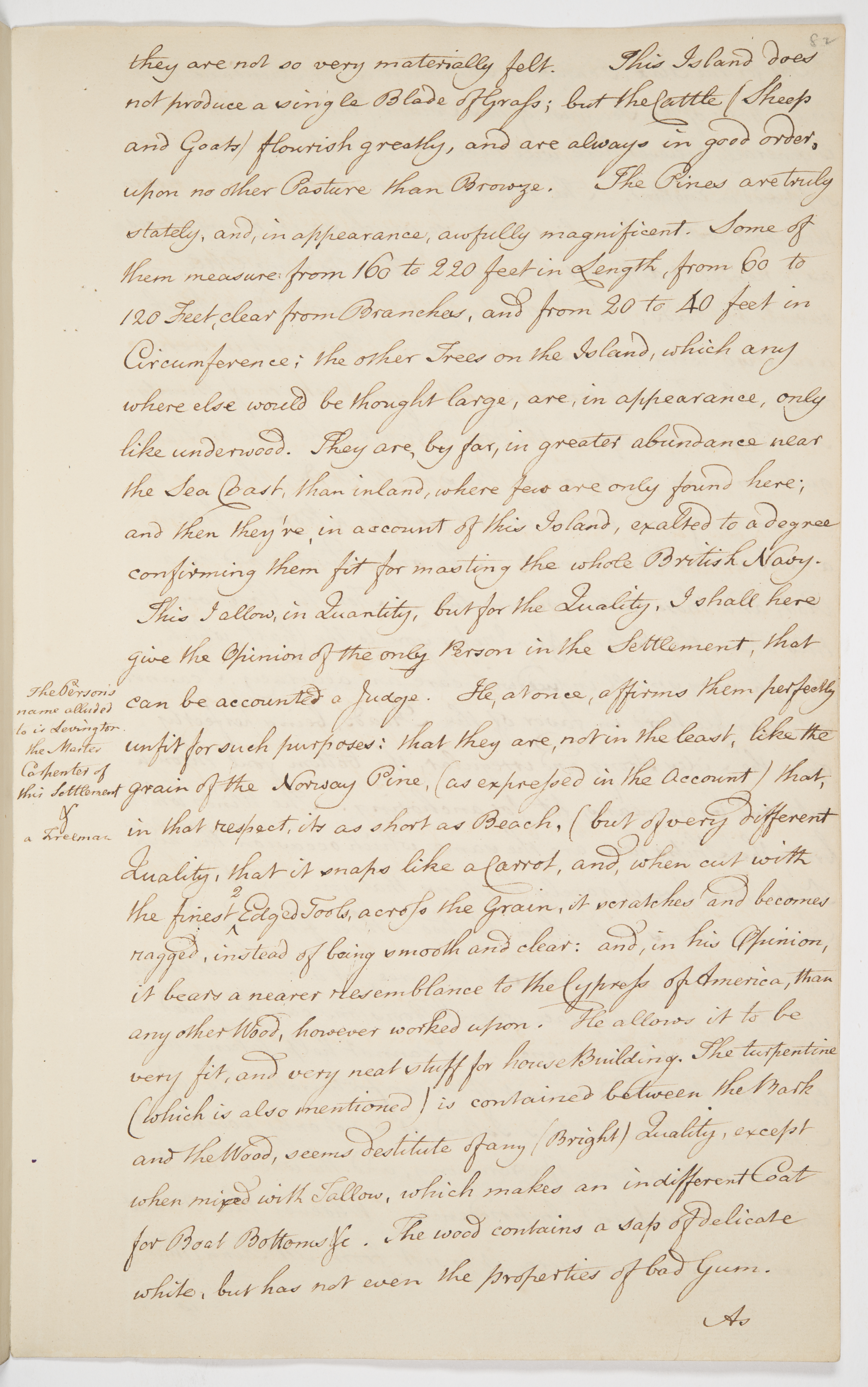 they are not so very materially felt. This Island does not produce a single Blade of Grass; but the cattle (Sheep and Goats) flourish greatly, and are always in good order, upon no other Pasture than Browze. The Pines are truly stately, and, in appearance, awfully magnificent. Some of them measure from 160 to 220 feet in length, from 60 to 120 feet, clear from the Branches, and from 20 to 40 feet in Circumference; the other trees on the Island, which any where else would be thought large, are, in appearance, only like underwood. They are, by far, in greater abundance near the Sea Coast, than inland, where few are only found here; and then they're, in account of this Island, exalted to a degree confirming them fit for masting the whole British Navy. This follows, in Quantity, but for the Quality, I shall here give the opinion of the only Person in the Settlement, that can be accounted a Judge. He, at once, affirms them perfectly unfit for such purposes; that they are, not in the least, like the grain of the Norway Pine, (as expressed in the account) that, in that respect, its as short as Beach, (but of very different quality, that it snaps like a carrot, and, when cut with the finest 2 Edged Tools, across the Grain, it scratches and becomes ragged, instead of being smooth and clear: and, in his Opinion, it bears a nearer resemblance to the Cypress of America, than any other wood, however worked upon. He allows it to be very fit, and every neat stuff for house Building. The turpentine (which is also mentioned) is contained between the Bark and the Wood, seems destitute of any (Bright) Quality, except when mixed with Tallow, which makes an indifferent Coat for Boat Bottoms &c. The wood contains a sap of delicate white, but has not even the properties of bad Gum.
