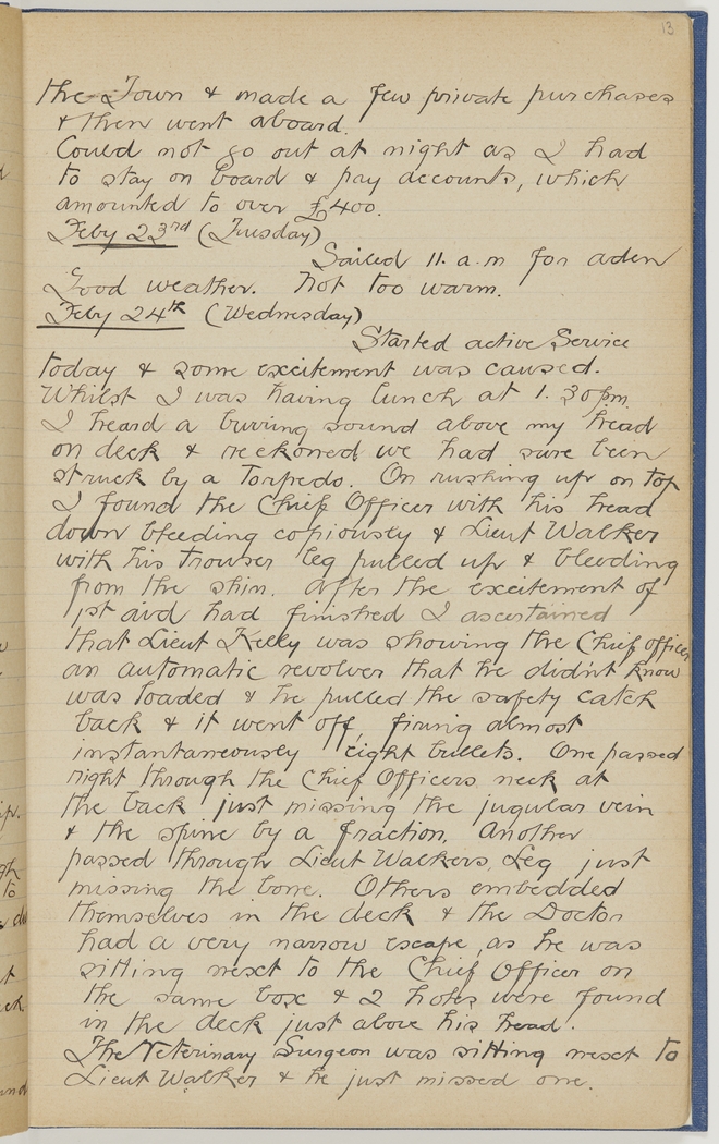 Started active Service today & some excitement was caused. Whilst I was having lunch at 1.30 p.m. I heard a burring sound above my head on deck & reckoned we had sure been struck by a Torpedo. On rushing up on top I found the Chief Officer with his head down bleeding copiously & Lieut Walker with his trouser leg pulled up & bleeding from the shin. After the excitement of 1st aid had finished I ascertained that Lieut Kelly was showing the Chief Officer an automatic revolver that he didn't know was loaded & he pulled the safety catch back & it went off, firing almost instantaneously eight bullets. One passed right through the Chief Officers neck at the back just missing the jugular vein & the spine by a fraction. Another passed through Lieut Walkers Leg just missing the bone. Others embedded themselves in the deck & the Doctor had a very narrow escape, as he was sitting next to the Chief Officer on the same box & & 2 holes were found in the deck just above his head. The Veterinary Surgeon was sitting next to Lieut Walker & he just missed one.