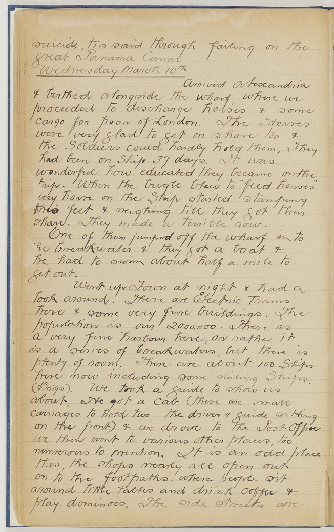 Arrived Alexandria & berthed alongside the wharf, where we proceeded to discharge horses & some cargo for poor London. The Horses were very glad to get on shore too & the Soldiers could hardly hold them. They had been on Ship 37 days. It was wonderful how educated they became on the trip. When the bugle blew to "feed horses" every horse on the Ship started stamping his feet & neighing till they got their share. They made a terrible row.