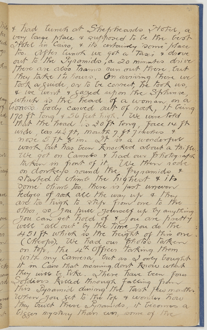 & had lunch at Shepheards Hotel, a very large place & supposed to be the best Hotel in Cairo, & its certainly "some" place too. After lunch we got a Taxi & drove out to the Pyramids, a 20 minutes drive. There are also trams run out there, but they take 1¼ hours. On arriving there we took a guide, or to be correct, he took us, & we went & gazed upon the Sphinx, which is the head of a woman on a lioness' body carved out of rock, it being 170 ft long & 56 feet high. We were told that the head is 30 ft long, face 14 ft wide, ear 4½ ft, mouth 7 ft 7 inches & nose 5 ft 8 in. It is a wonderful work, but has been knocked about a trifle. We got on Camels & had our photograph taken in front of it. We then rode on donkeys round the pyramids & started to climb the highest & its "some" climb too, there is just uneven ledges of rock all the way up & they are too high to step from one to the other, so you pull yourself up by anything you can get hold of & you are pretty well "all out" by the time you do the 451 ft which is the height of this one (Cheops). We had our photo's taken on top, the 4th Officer taking them with my camera, but as I only bought it in Cairo that morning, dont know what they will be like. There have been four Soldiers killed through falling from this Pyramid during the last few months. When you get to the top & wonder how they built these Pyramids, it becomes a bigger mystery than ever, some of the