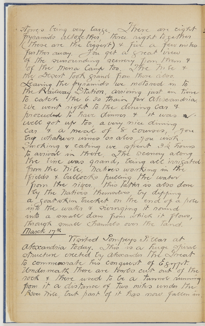 stones being very large. There are eight pyramids altogether, three right together (these are the biggest) & five a few miles further away. You get a great view of the surrounding scenery from them & of the Mena Camp too. The Nile & the Desert look grand from there also. Leaving the pyramids we motored in to the Railway Station, arriving just in time to catch the 6.30 train for Alexandria. We went right to the dining car & proceeded to have dinner & it was a well got up too, a very nice dining car & a meal of 8 courses, you buy whatever wines or ales you wish. Smoking & eating we spent 3½ hours to arrival in there. The scenery along the line was grand, being all irrigated from the Nile, Natives working in the fields & bullocks pulling the water from the river, this latter is also done by the Natives themselves, by dipping a goat skin bucket on the end of a pole into the water & swinging it round into a small dam from which it flows, through small channels over the land.