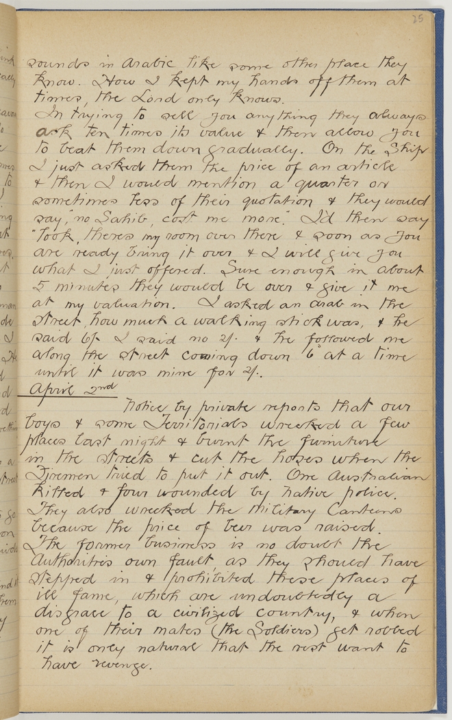 Notice by private reports that our boys & some Territorials wrecked a few places last night & burnt the furniture in the streets & cut the hoses when the Firemen tried to put it out. One Australian killed & four wounded by Native police. They also wrecked the Military Canteens because the price of beer was raised. The former business is no doubt the Authorities own fault, as they should have stepped in & prohibited these places of ill fame, which are undoubtedly a disgrace to a civilized country, & when one of their mates (the Soldiers) get robbed it is only natural that the rest want to have revenge.