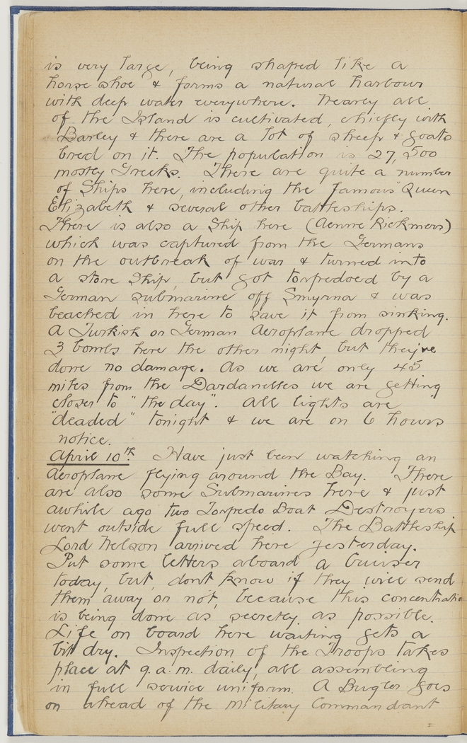 April 10th Have just been watching an aeroplane flying around the Bay. There are also some Submarines here & just awhile ago two Torpedo Boat Destroyers went outside full speed. The Battleship Lord Nelson arrived here yesterday. Put some letters aboard a Cruiser today, but, dont know if they will send them away or not, because this concentration is being done as secretly as possible. Life on board here waiting gets a bit dry. Inspection of the Troops takes place at 9 a.m. daily, all assembling in full service uniform. A Bugler goes on ahead of the Military Commandant