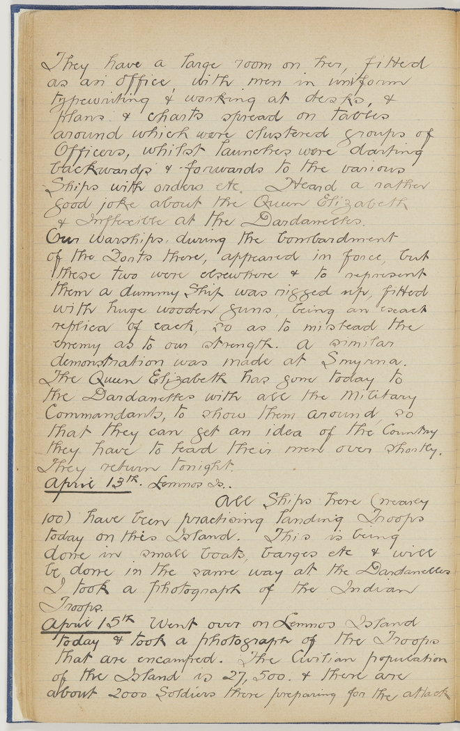 Our warships, during the bombardment of the Forts there, appeared in force, but these two were elsewhere & to represent them a dummy Ship was rigged up, fitted with huge wooden guns, being an exact replica of each so as to mislead the enemy as to our strength. A similar demonstration was made at Smyrna. The Queen Elizabeth has gone today to the Dardanelles with all the Military Commandants, to show them around, so that they can get an idea of the Country they have to lead their men over shortly. They return tonight.