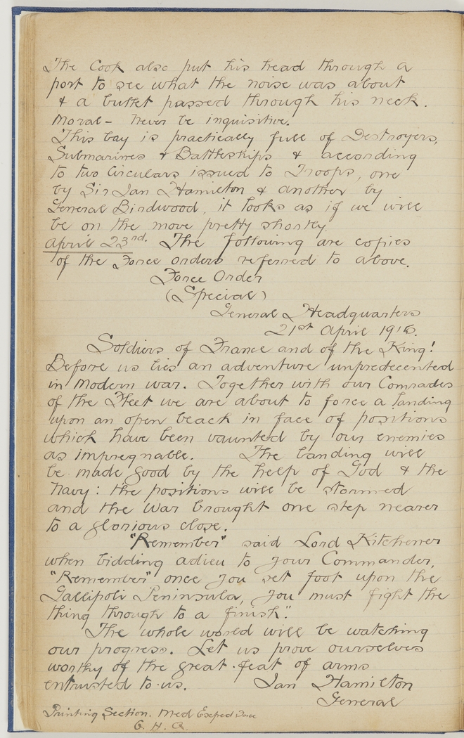 Soldiers of France and of the King! Before us lies an adventure unpredecented in Modern war. Together with our Comrades of the Fleet we are about to force a landing upon an open beach in face of positions which have been vaunted by our enemies as impregnable. The landing will be made good by the help of God & the Navy: the positions will be stormed and the war brought one step nearer to a glorious close.