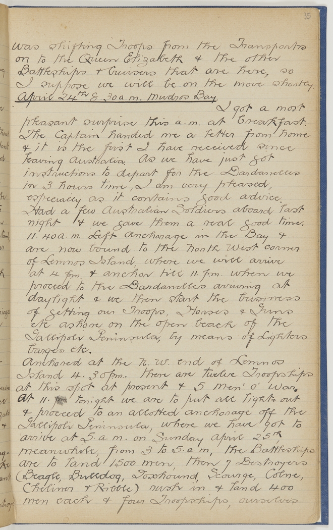 Anchored at the N.W. end of Lemnos Island 4.30 p.m. There are twelve Troopships at this spot at present & 5 Men' o' War. At 11 p.m. tonight we are to put all lights out & proceed to an allotted anchorage off the Gallipoli Peninsula, where we have got to arrive at 5 a.m. on Sunday April 25th. Meanwhile, from 3 to 5 a.m., the Battleships are to land 1500 men, then 7 Destroyers (Beagle, Bulldog, Foxhound, Scourge, Colne, Cheliner & Ribble) rush in & land 400 men each & four Troopships, ourselves