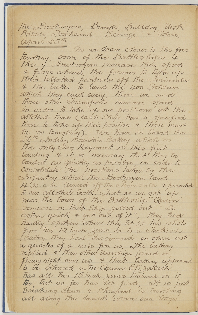 4.30 a.m. Arrived off the Peninsula & proceeded to our allotted berth. Just as we go up near the bows of the Battleship "Queen" someone on that ship yelled out "Go astern quick & get out of it", they had hardly spoken when they let go two shots from two 12 inch guns, on to a Turkish Battery they had discovered on shore not a quarter of a mile from us. The battery replied & then other Warships joined in, firing right over us & that battery appeared to be silenced. The Queen Elizabeth has all her 15 inch guns trained on it too, but so far has not fired. It is just breaking dawn & shrapnel is bursting all along the beach where our boys