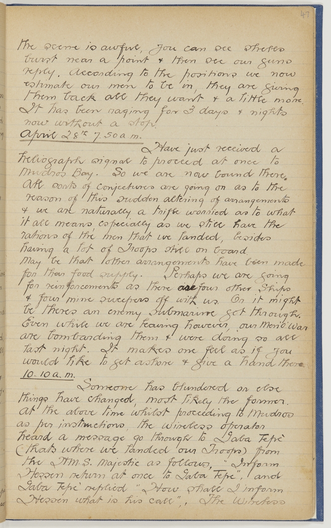 Have just received a heliograph signal to proceed at once to Mudros Bay. So we are now bound there. All sorts of conjectures are going on as to the reason of this sudden altering of arrangements & we are naturally a trifle worried as to what it all means, especially as we still have the rations for the men that we landed, besides having a lot of Troops still on board.