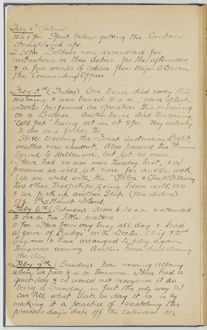 Feby 5th (Friday) One horse died early this morning & was buried 11 a.m., "some splash". Doctor performed an operation this morning on a Soldier. Another horse died this evening, "cold feet" having set in at 8 p.m. Very unlucky to die on a Friday too.