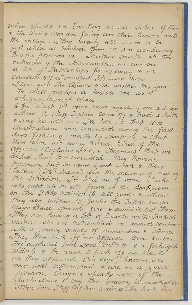6 p.m. Just got some news regarding our doings ashore. A Staff Captain came off & had a bath & some tea with us. He told us that 1500 Australians were wounded during the first days fighting, mostly by shrapnel, & that there were not many killed. Two of the Officers (Captains Kirby & Chapman) that we landed, have been wounded, they however, previously put in some great work & their battery (26th Indian) were the means of saving the situation. He told us of some Turks who crept up on all fours in the darkness on the Sihks position (6, 10lb guns) & when they were within 15 yards the Sihks under Major Bruce, opened fire & annihilated them. They are having a lot of trouble with Turkish snipers who are entrenched in covered positions with a goodly supply of ammunition & stores. They then pick off our Officers. One sniper they captured had 2000 bullets & a fortnights rations & he used to pick off our scouts as they appeared. Our boys, however, are now well entrenched & are in a good position. Everyone speaks well of the Australians & say their bravery is remarkable. When this Staff Captain arrived he had two