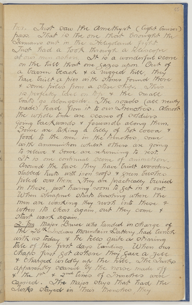 2 p.m. Major Bruce who landed in charge of the 26th Indian Mountain Battery, had lunch with us today & he tells quite a stirring tale of the first days landing. When our chaps first got ashore they gave a yell & charged wildly up the hill. The Turks apparently scared by the noise made off & the 1st & 2nd lines of Trenches were carried. The major says that had the Turks stayed in their trenches, they