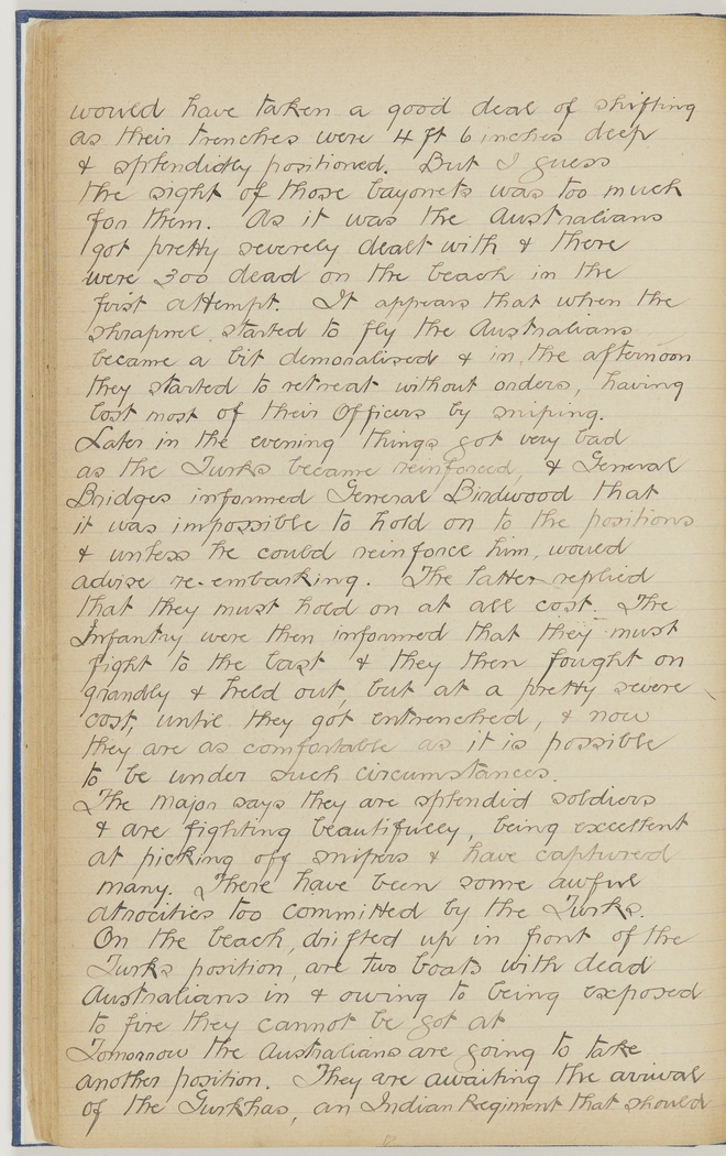 Later in the evening things got very bad as the Turks became reinforced, & General Bridges informed General Birdwood that it was impossible to hold on to the positions & unless he could reinforce him, would advise re-embarking. The latter replied that they must hold on at all cost. The Infantry were then informed that they must fight to the last & they then fought on grandly & held out, but at a pretty severe cost, until they got entrenched, & now they are as comfortable as it is possible to be under such circumstances.