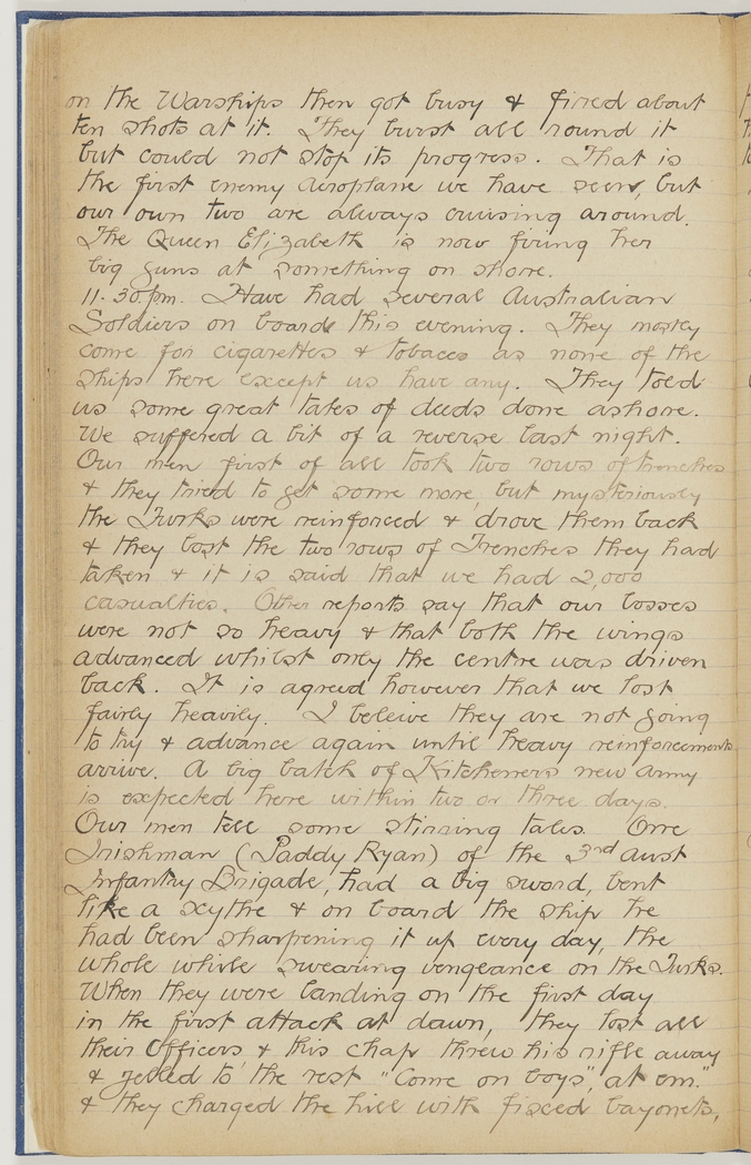 11.30 p.m. Have had several Australian Soldiers on board this evening. They mostly come for cigarettes & tobacco as none of the ships here except us have any. They told us some great tales of deeds done ashore. We suffered a bit of a reverse last night. Our men first of all took two rows of trenches & they tried to get some more, but mysteriously the Turks were reinforced & drove them back & they lost the two rows of Trenches they had taken & it is said that we had 2,000 casualties. Other reports say that our losses were not so heavy & that both the wings advanced whilst only the centre was driven back. It is agreed however that we lost fairly heavily. I believe they are not going to try & advance again until heavy reinforcements arrive. A big batch of Kitcheners new army is expected here within two or three days. Our men tell some stirring tales. One Irishman (Paddy Ryan) of the 3rd Aust Infantry Brigade, had a big sward, bent like a scythe & on board the ship he had been sharpening it up every day, the whole while swearing vengeance on the Turks. When they were landing on the first day in the first attack at dawn, they lost all their Officers, & this chap threw his rifle away & yelled to the rest "Come on boys," at em." & they charged the hill with fixed bayonets,