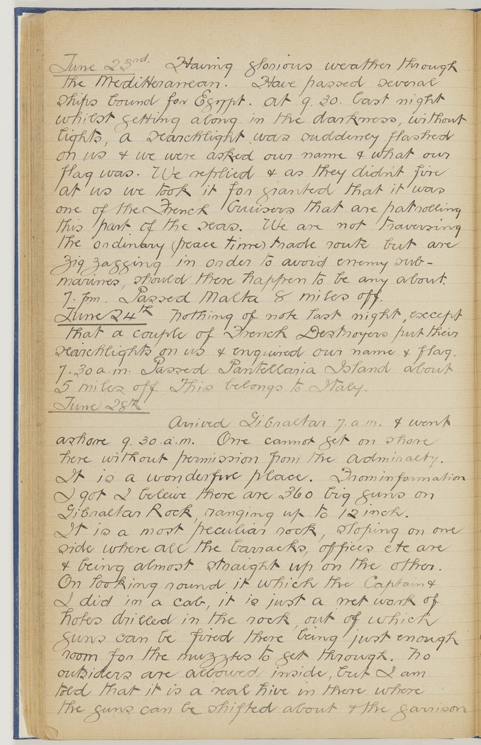 June 23rd Having glorious weather through the Meditteranean. Have passed several ships bound for Egypt. At 9.30 last night whilst getting along in the darkness, without lights, a searchlight was suddenly flashed on us & we were asked our name & what our flag was. We replied & as they didn't fire at us we took it for granted that it was one of the French Cruisers that are patrolling this part of the seas. We are not traversing the ordinary (peace time) trade route but are zig zagging in order to avoid enemy submarines, should there happen to be any about. 7.p.m. Passed Malta 8 miles off.