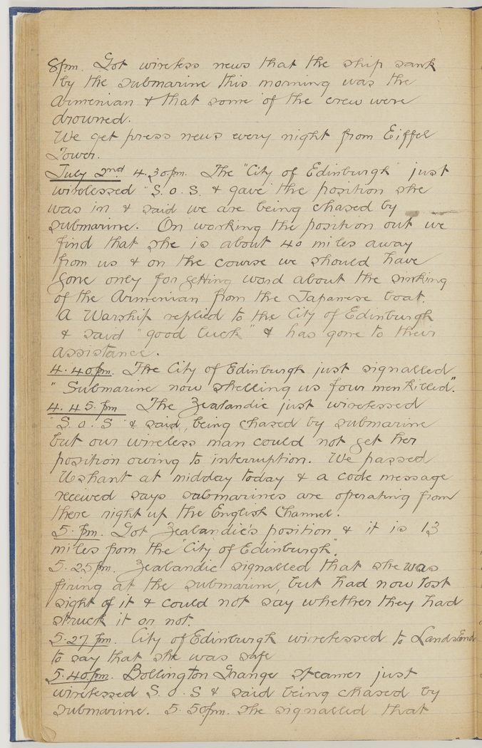4.45 p.m. The Zealandic just wirelessed "S.O.S." & said, "being chased by submarine but our wireless man could not get her position owing to interruption. We passed Ushant at midday today & a code message received says submarines are operating from there right up the English Channel.