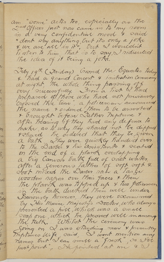 Feby 19th (Friday) Crossed the Equator today & had a grand Concert & initiation ceremony at night, the whole thing passing off very successfully. From a list I had prepared of those who had not previously crossed the "line", a policeman announced the name & ordered them to be arrested & brought before Father Neptune & after hearing if they had any defence to make, as to why they should not be dipped & shaved, he ordered that they be given a bath. They were quickly handed over to the Barber & his assistants & seated on the end of plank overlapping a big Canvas bath full of salt water. After a generous lather of soft soft & soot mixed the Barber ran a large wooden razor over their faces & then the plank was tipped up & two policemen in the bath ducked them well under. Previously however, they were examined by His Marine Majesty's Doctor, who always prescribed a pill, which was a small soap one, which he pressed well in among the teeth. Whilst the ceremony was going on I was standing near & presently Neptunes Wife said "I wont mention any names but I can smell a "fresh", so I'll just point". He pointed at me & I