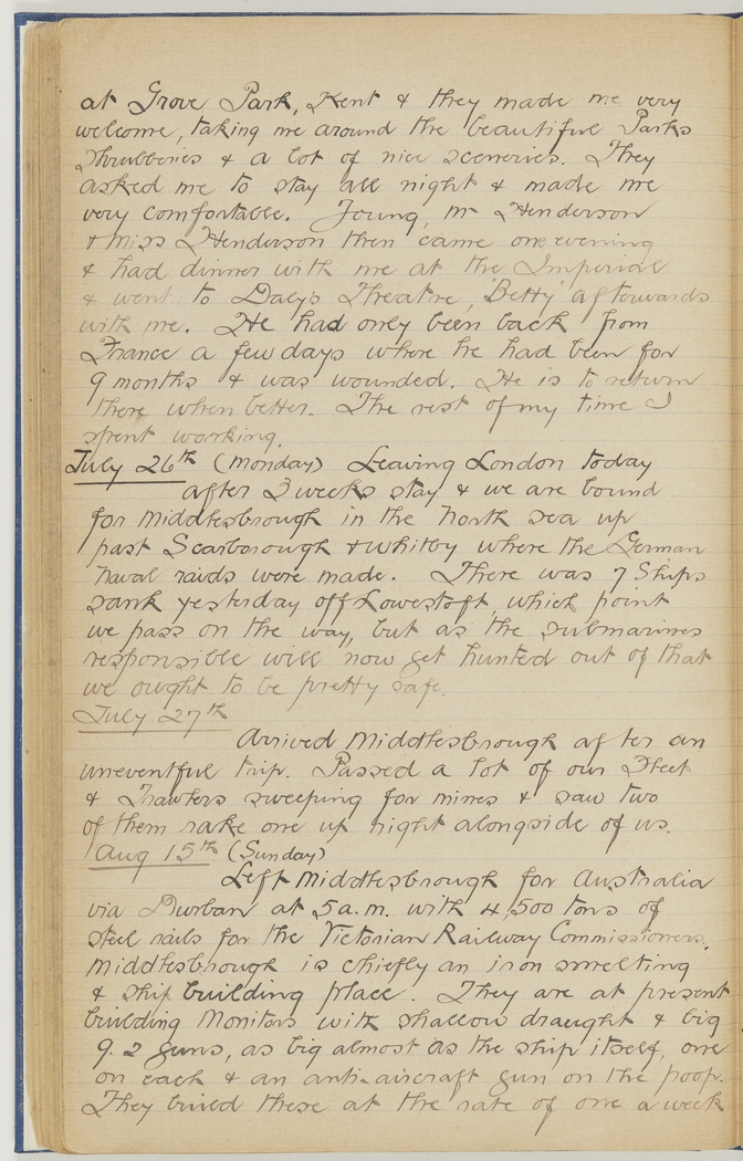 July 26th (Monday) Leaving London today after 3 weeks stay & we are bound for Middlesbrough in the North sea up past Scarborough & Whitby where the German Naval raids were made. There was 7 ships sank yesterday off Lowestoft, which point we pass on the way, but as the submarines responsible will now get hunted out of that we ought to be pretty safe.