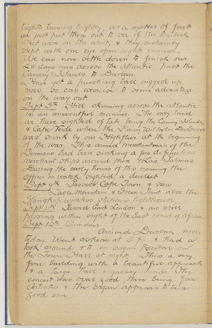 Sept 5th Still skimming across the atlantic in an uneventful manner. The only land we have sighted of late being the Canary Islands, & Cape Verde where the Kaiser Wilhelm Der Grosse was sunk by our "Highflier" at the beginning of the war. This armed merchantman of the Germans had been sinking a few defenceless merchant ships around there & Las Palmas During the early hours of this morning the Officer on watch sighted a derelict