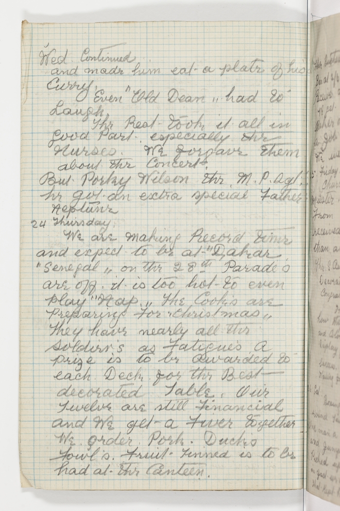 24 Thursday. We are making Record Time and expect to be at "Dakar Senegal" on the 28th Parade's are off it is too hot to even play "Nap". The Cook's are Preparing For "Christmas" They have nearly all the soldier's as Fatigues. A prize is to be awarded to each Deck for the best decorated Table. Our Twelve are still Financial and we get a Fiver together We order Pork. Duck's Fowl's Fruit Tinned is to be had at the Canteen. The Butcher Promises us a ½ Doz of Beer at 2/6 a Bottle. We are to receive a Bottle each as an issue We get cakes Etc through the Baker one of our Mess took a Job with the Baker's so we were set.
