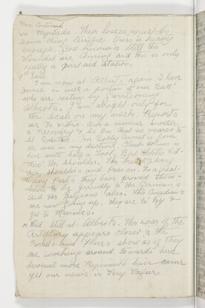 9th Tues. I am now at Albert's again. I have joined in with a portion of our Battn who are resting by Garrisoning Albert's. I am alright only for the scab on my neck. Report's are To & Fro. One a reverse another a Recovery & so on But no nearer to St Quinten. Poor Bobby Emmet is gone he was in my section. Claude Holmes is here with half a Foot. Bert Fletcher Hit through the Shoulder. The French shrug their shoulder's and Pass on. In a great many Part's they have proved them-selves to be freindly to the German's And the Belgian's also. The Canadian's are now going up. They are to try & get to Messine's.