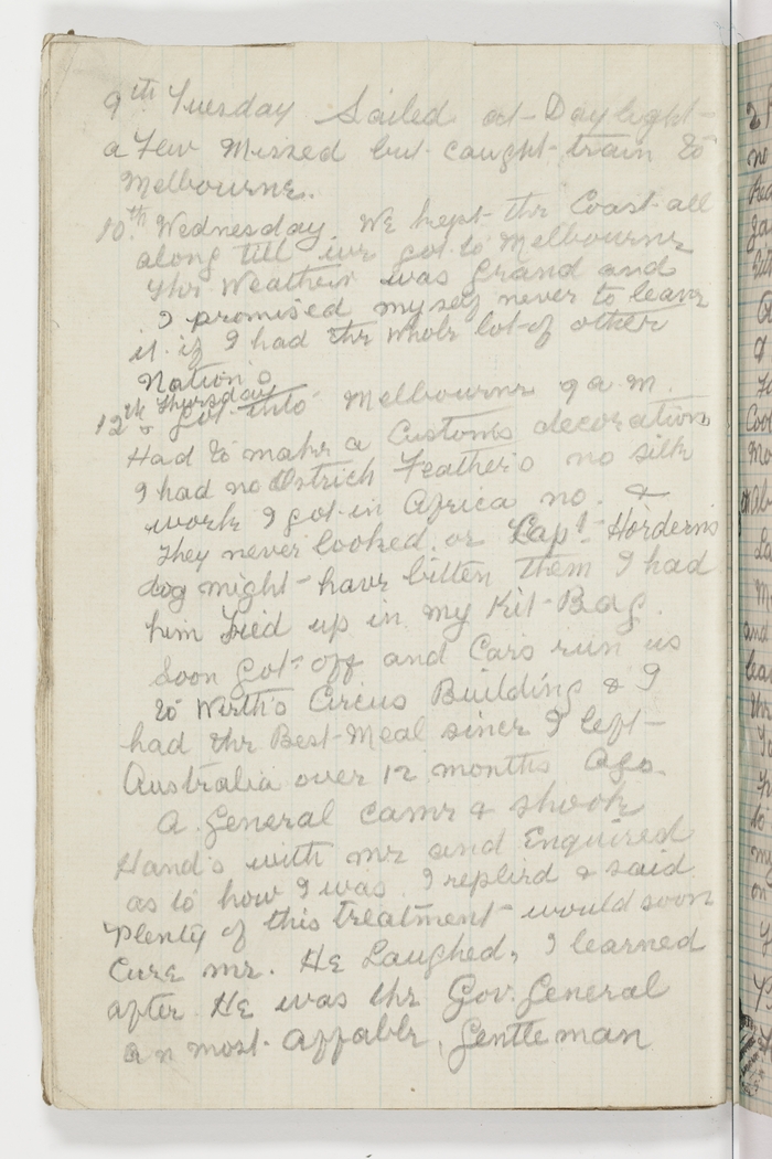 12th Thursday. Got into Melbourne 9 a.m. Had to make a Customs decoration I had no Ostrich Feather's no silk work I got in Africa no. & They never looked or Capt Hordern's dog might have bitten them I had him Tied up in my Kit Bag. Soon got off and Cars run us to Werth's Circus Building & had the Best Meal since I left Australia over 12 months ago. A General came & shook Hand's with me and Enquired as to how I was. I replied & said plenty of this treatment would soon cure me. He Laughed, I learned after He was the Gov. General a most affable Gentleman