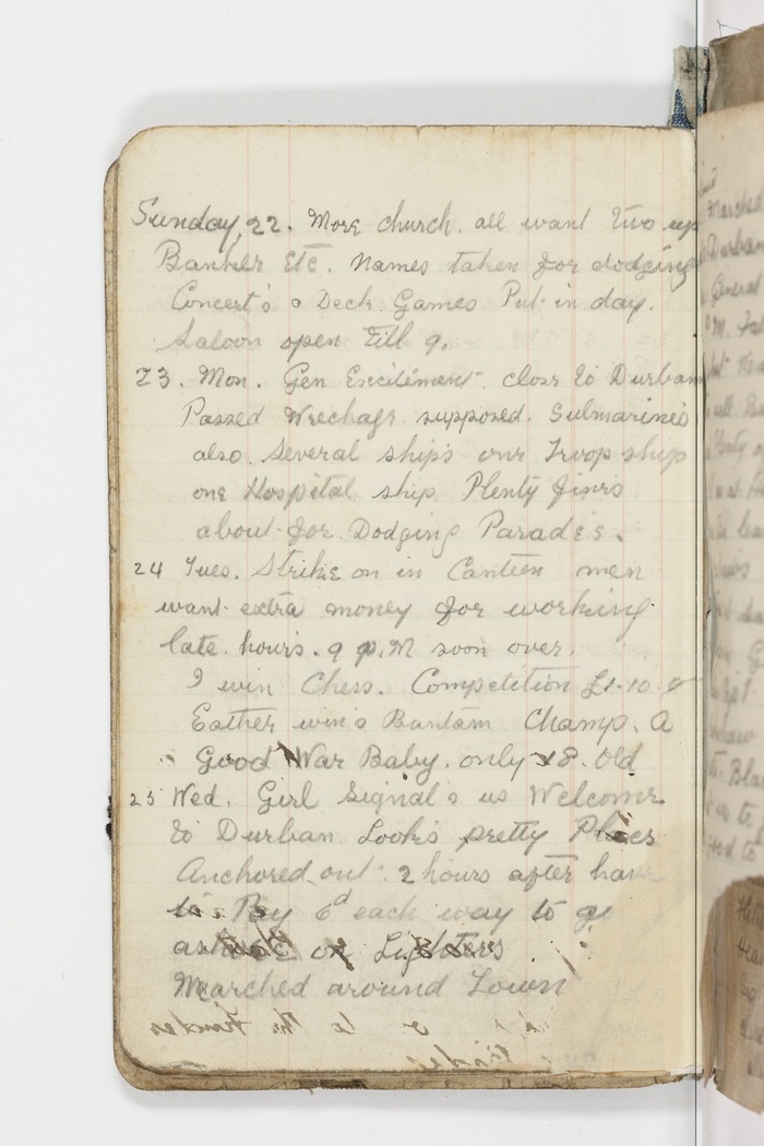 23. Mon. Gen. Excitement close to Durban Passed Wreckage supposed Submarine's also Several ship's our Troopship one Hospital ship. Plenty fine's about for Dodging Parade's.