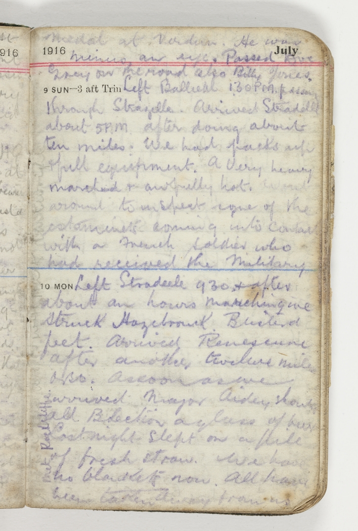Left [Stradeele] 9.30 & after about an hours marching we struck Hazebrouck. Blistered feet. Arrived [Renescure] after another twelve miles or so. As soon as we arrived Major Aidey shouts all B Section a glass of beer. Last night slept on a pile of fresh straw. We have no blankets now. All have been taken away from us.