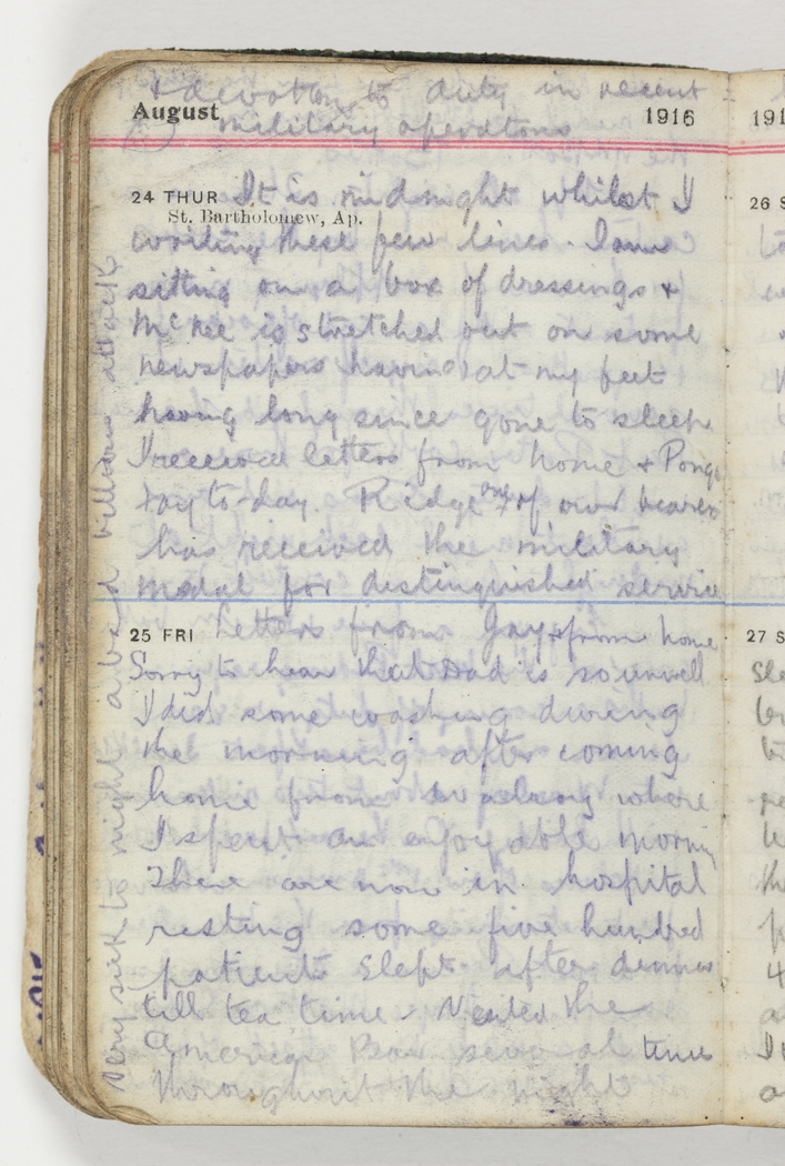 It is midnight whilst I writing these few lines. I am sitting on a box of dressings & McGee is stretched out on some newspapers having sat my feet having long since gone to sleep. I received letters from home & Pongo Fay to-day. Ridge one of our bearers has received the military medal for distinguished service [text continued at top of page]